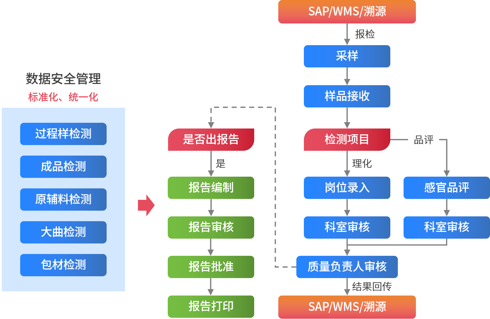 通過融合先進(jìn)的數(shù)字化實(shí)驗(yàn)室管理理念、規(guī)范和方法,SW-LIMS結(jié)合白酒行業(yè)企業(yè)的實(shí)際業(yè)務(wù)管理需要,對(duì)檢驗(yàn)業(yè)務(wù)流程進(jìn)行優(yōu)化,對(duì)現(xiàn)有檢驗(yàn)管理方式(如線下業(yè)務(wù)轉(zhuǎn)線上業(yè)務(wù),紙質(zhì)單據(jù)轉(zhuǎn)電子單據(jù)等)進(jìn)行改革,打通上下游系統(tǒng),實(shí)現(xiàn)報(bào)檢下樣、結(jié)果報(bào)出與企業(yè)現(xiàn)有系統(tǒng)自動(dòng)對(duì)接(如SAP、WMS、SRM,溯源等企業(yè)已有系統(tǒng)),使得業(yè)務(wù)流程設(shè)定更加靈活、規(guī)范、高效,更貼近實(shí)際業(yè)務(wù),實(shí)現(xiàn)對(duì)業(yè)務(wù)工作的可知、可控、可預(yù)測(cè)管理,實(shí)現(xiàn)對(duì)實(shí)驗(yàn)室資源的信息化管理,實(shí)現(xiàn)實(shí)驗(yàn)室業(yè)務(wù)的規(guī)范化、自動(dòng)化、數(shù)字化管理,且系統(tǒng)中各業(yè)務(wù)均支持自定義、可視化配置,進(jìn)一步提升了各檢驗(yàn)機(jī)構(gòu)的業(yè)務(wù)管理水平。