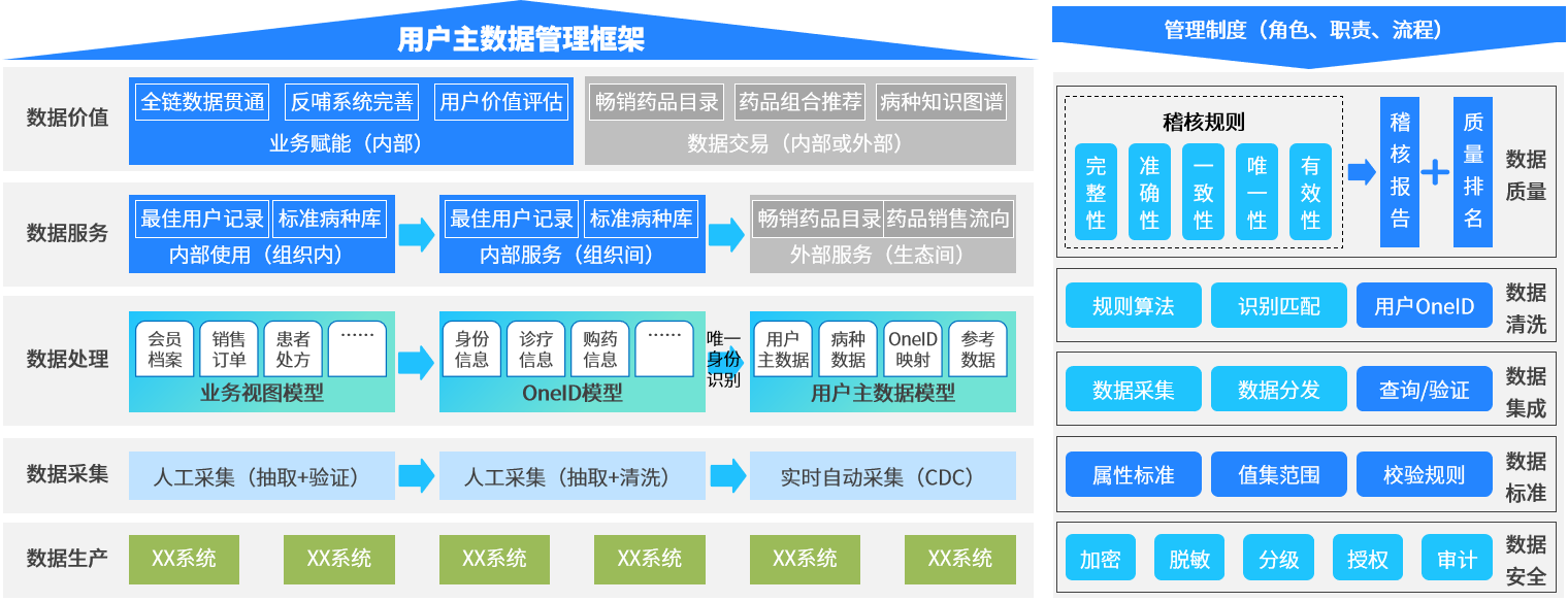 用戶主數(shù)據(jù)項(xiàng)目是該藥企數(shù)字化轉(zhuǎn)型基礎(chǔ)數(shù)據(jù)優(yōu)化階段的重要組成部分。制定數(shù)據(jù)管理制度、數(shù)據(jù)標(biāo)準(zhǔn)、優(yōu)化數(shù)據(jù)質(zhì)量、數(shù)據(jù)的安全合規(guī)使用是用戶主數(shù)據(jù)項(xiàng)目的主要目標(biāo),同時也是用戶主數(shù)據(jù)項(xiàng)目的核心。通過項(xiàng)目建設(shè),統(tǒng)一企業(yè)各C端業(yè)務(wù)系統(tǒng)中用戶數(shù)據(jù)標(biāo)準(zhǔn),提升用戶數(shù)據(jù)質(zhì)量,在企業(yè)內(nèi)部安全合規(guī)地使用及管理用戶數(shù)據(jù),從而支撐業(yè)務(wù)經(jīng)營分析、輔助決策,發(fā)揮用戶數(shù)據(jù)價值,實(shí)現(xiàn)企業(yè)數(shù)字化轉(zhuǎn)型目標(biāo)。