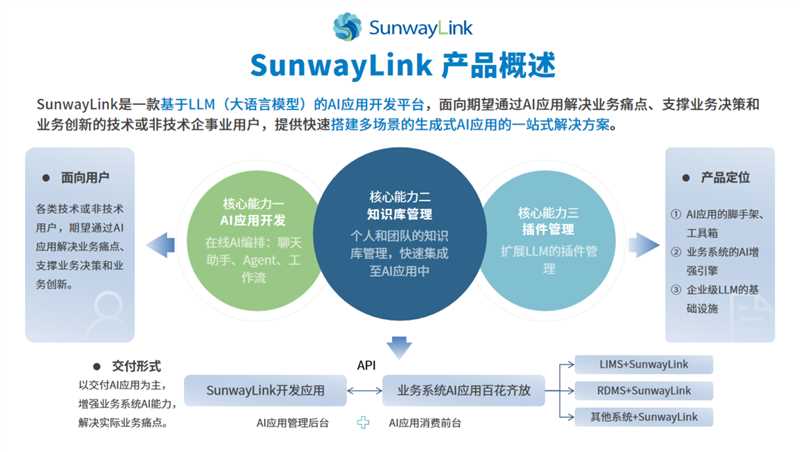SunwayLink是一款基于LLM(大語言模型)的AI應(yīng)用開發(fā)平臺(tái),面向期望通過AI應(yīng)用解決業(yè)務(wù)痛點(diǎn)、支撐業(yè)務(wù)決策和業(yè)務(wù)創(chuàng)新的技術(shù)或非技術(shù)企事業(yè)用戶,提供快速搭建多場景的生成式AI應(yīng)用的一站式解決方案??梢蕴峁┝奶熘?、智能體、工作流三種應(yīng)用開發(fā)能力,開發(fā)好的應(yīng)用可快速封裝為API,可由后端或前端應(yīng)用直接調(diào)用,提供基于RAG(檢索增強(qiáng)生成)技術(shù)的可視化知識(shí)庫構(gòu)建能力,快速接入結(jié)構(gòu)化和非機(jī)構(gòu)化數(shù)據(jù)構(gòu)建個(gè)人和企業(yè)知識(shí)庫。