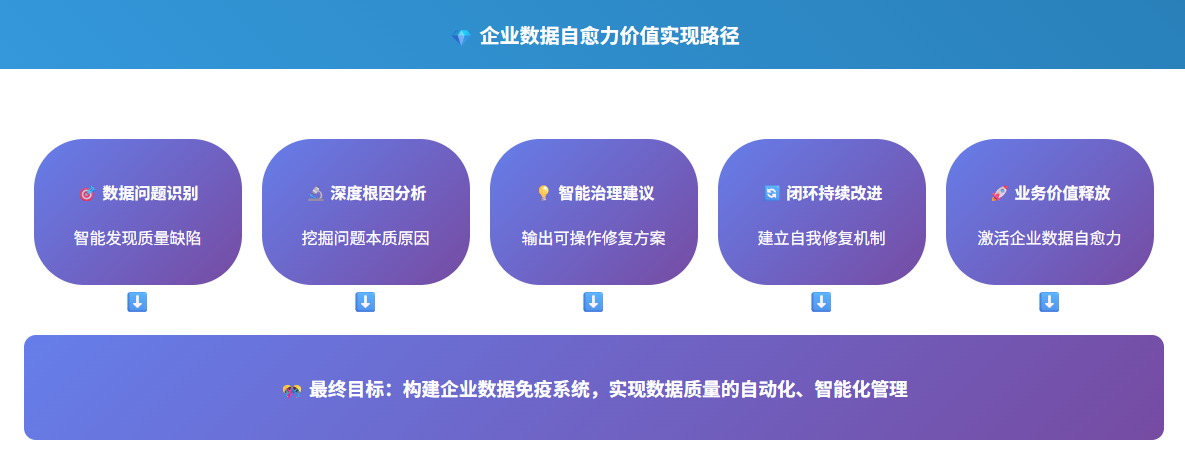 將數據質量從 IT 部門的 “后臺任務” 升級為全員的 “共同責任”。通過直觀的報告解讀,讓業(yè)務負責人實時感知其領域數據健康狀態(tài)變化,規(guī)避因數據問題導致的決策失誤。長期沉淀的質量解讀知識庫,更持續(xù)賦能團隊識別數據隱患,提升企業(yè)整體數據免疫力。