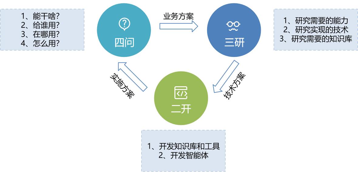 2、三研:研究需要的能力、研究實(shí)現(xiàn)的技術(shù)、研究需要的知識(shí)庫(kù),是智能體“設(shè)計(jì)階段”需要研究的內(nèi)容,主要進(jìn)行智能體開發(fā)的可行性分析和實(shí)現(xiàn)路徑設(shè)計(jì),該階段最終輸出技術(shù)方案。