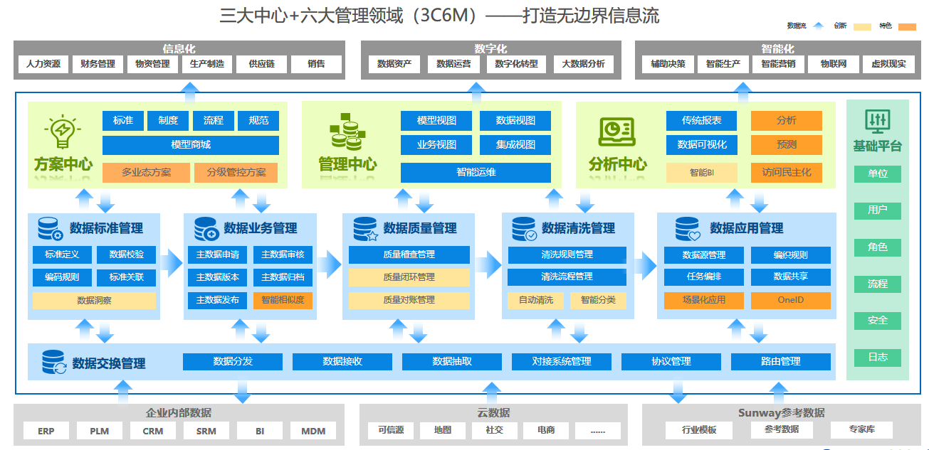 北京三維基于在主數(shù)據管理領域深耕細作,整合為眾多特大型央企和集團型企業(yè)的項目建設經驗,融合了數(shù)據標準管理、數(shù)據生命周期管理、數(shù)據交換管理、數(shù)據質量管理、數(shù)據清洗管理、數(shù)據應用管理六大模塊,方案中心、分析中心、管理中心三大中心以及Mobile移動辦公,打造3C6M—體化主數(shù)據管理解決方案,為客戶提供從標準建立、數(shù)據質量管控、數(shù)據交換應用、數(shù)據治理,到企業(yè)數(shù)據方案中心建設、數(shù)據場景化的深入應用、智能化數(shù)據管理、智能化運維等全面的管控、洞察、應用一體化解決方案,為企業(yè)數(shù)據標準化建設、數(shù)據治理提供強大支持,助力企業(yè)實現(xiàn)無邊界信息流。